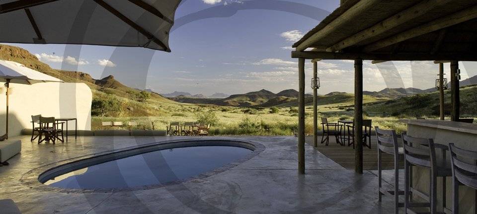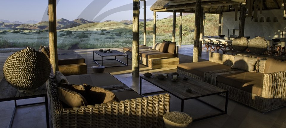 Set in the Huab River Valley, Damaraland Camp’s location gives guests stunning views of the stark plains, ancient valleys and mountainous backdrops of the region. The suites are all very spacious, raised off the ground with their own private verandas where guests can relax and enjoy the views. The main lodge has a large lounge are and swimming pool, as well as an open air “Boma” where guests can enjoy dinner under the stars.